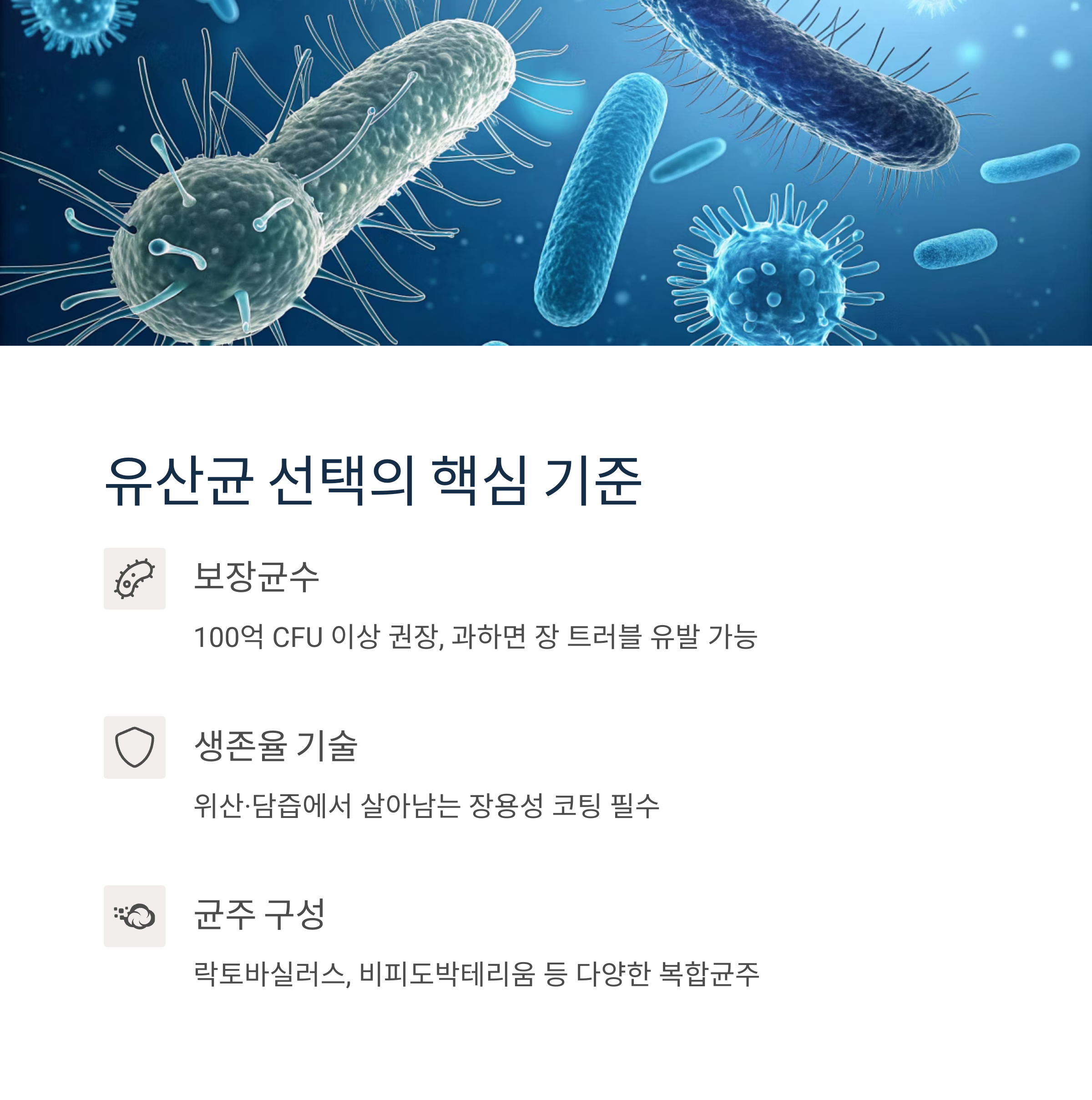 복합균주, 장용성 코팅, 프리바이오틱스 함유 여부, 안전한 원료 기술이 진짜 기준입니다.