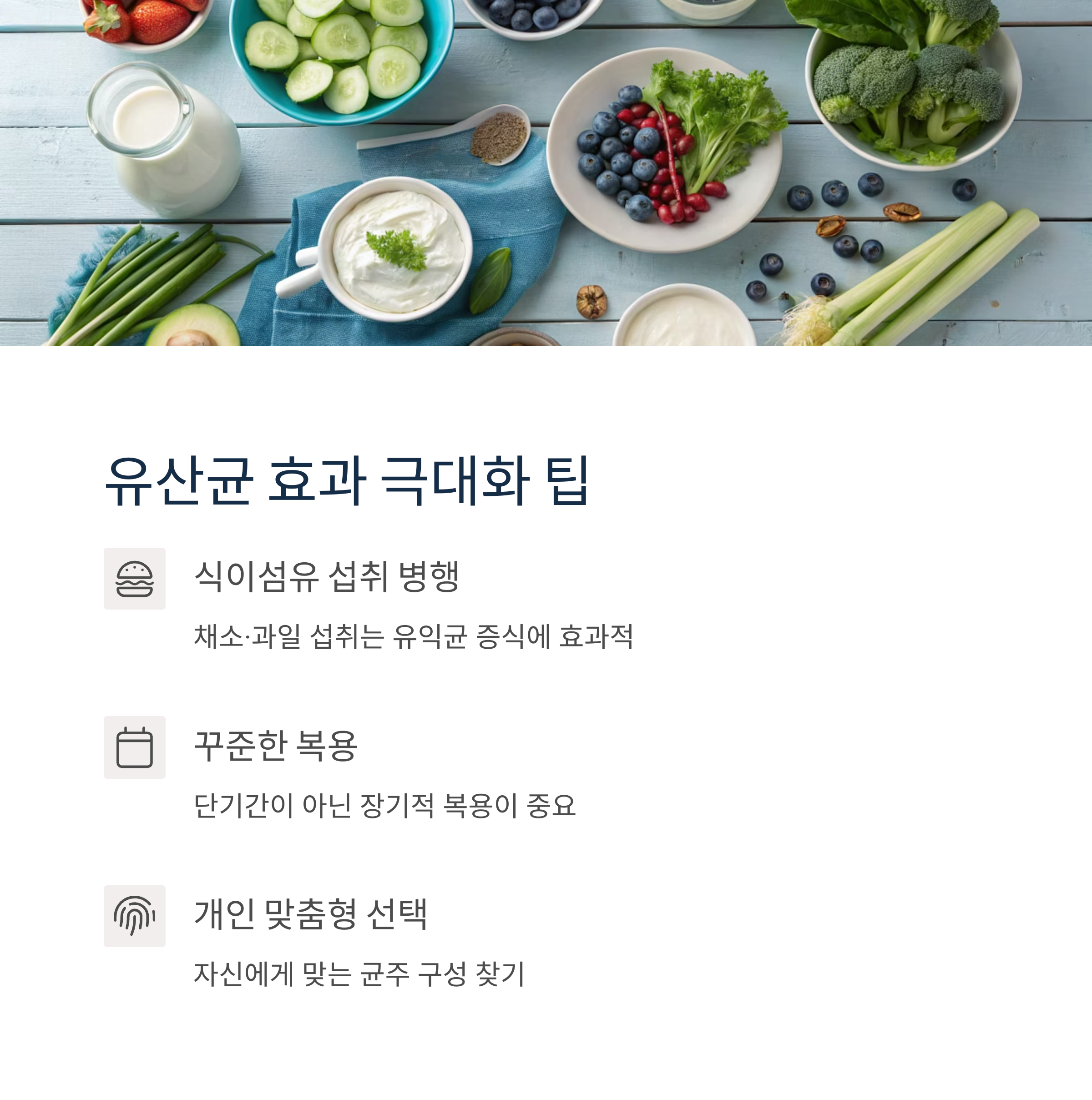 - 식이섬유 섭취 병행: 채소·과일 섭취는 유익균 증식에 효과적