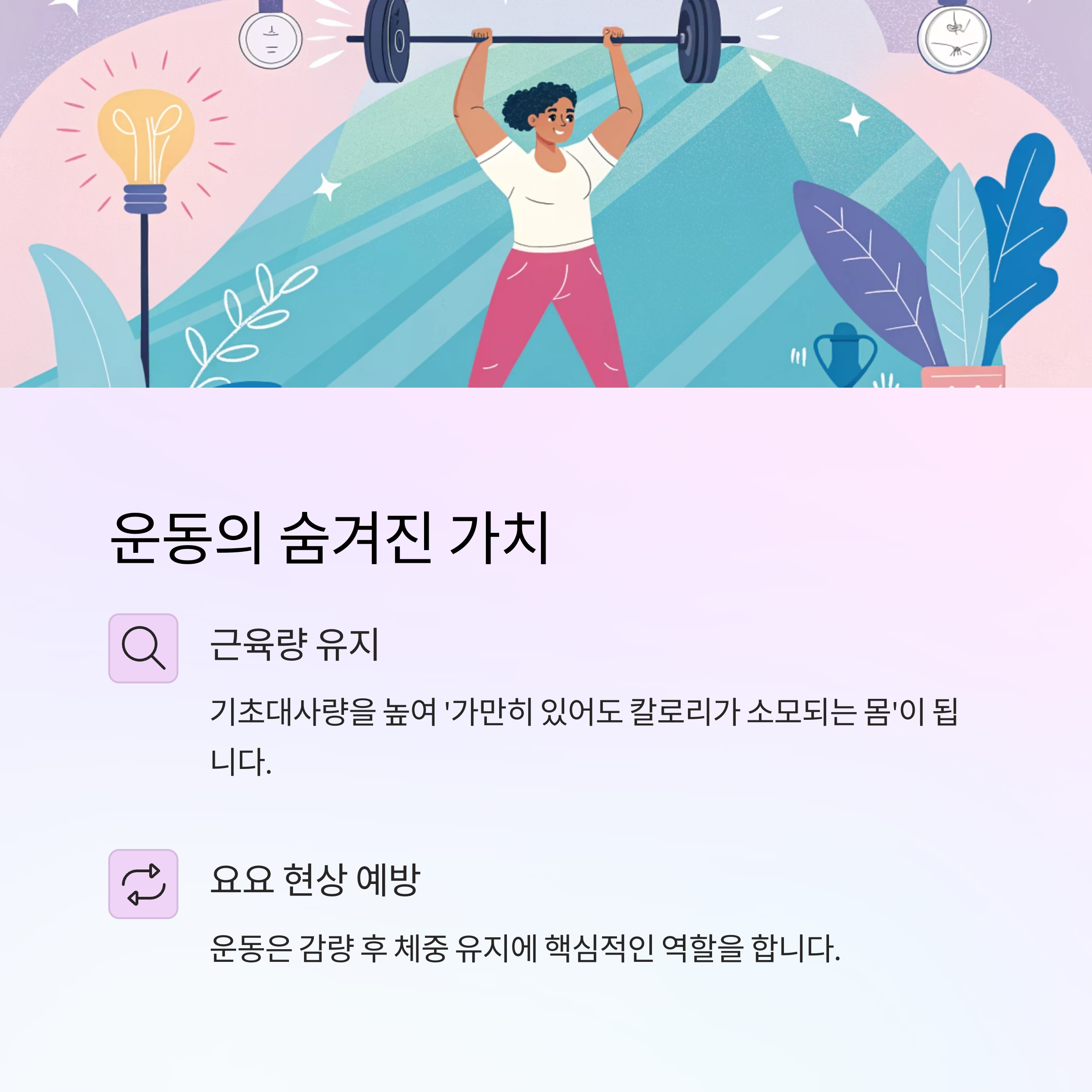 극단적 식단만으로는 유지가 어렵고, 운동 없이 만든 감량은 오래가지 않습니다.